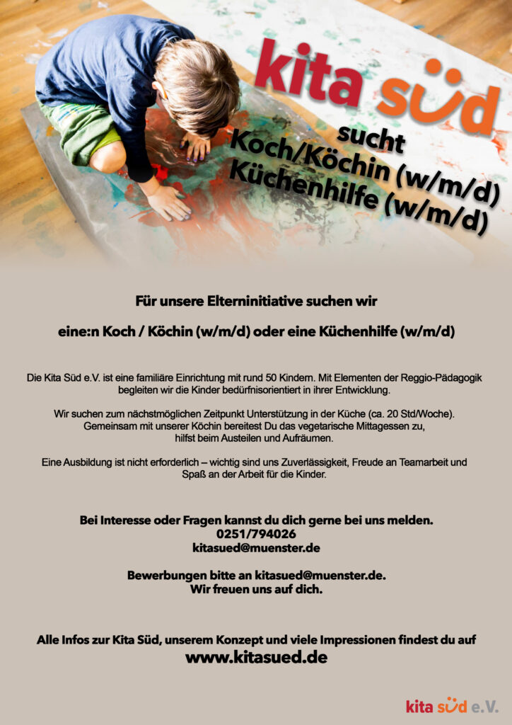 Im Jahr 1986 wurde unsere Kindertagesstätte als Elterninitiative in Münster gegründet. Die Kita Süd e.V. ist eine familiäre Einrichtung mit 3 Gruppen (bis zu 50 Plätze für Kinder im Alter von 1-6 Jahren). Im Oktober 2023 konnten wir unsere tollen neuen Räumlichkeiten an der Roddestraße beziehen. Das Team der Einrichtung besteht aus einer freigestellten Leitung, sowie Fach- und Ergänzungskräften. Zwei Köchinnen sorgen täglich für ein frisches und vegetarisches Mittagessen.